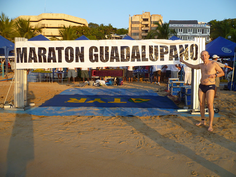 Dia da prova de 1000m do Marathon Guadalupano. Logo entendemos qual o sentido do termo maratona neste caso: nadar os 1000 m é a parte fácil. São mais de 4000 nadadores inscritos que devem ser levados até uma pequena ilha e de lá vem nadando. Então pode-se imaginar a logística que deveria estar preparada para isto. Enfim, após algumas dificuldades, todas superadas, a parte da natação foi ótima. Água limpa e quente, mar calmo e sem correntes, completamos mais uma! Voltamos da travessia em um ônibus local todo colorido tocando bem alto músicas do Roberto Carlos cantando em espanhol. A passagem custa 5 pesos mas a música e todo o conjunto da situação inusitada nao tem preço! Depois, à noite fomos ver a atração mais emblemática de Acapulco. Os Clavadistas de La Quebrada. Jovens mergulham de uma altura de até 35 metros entre os rochedos em um lugar que a profundidade é em torno de 7 m. Então eles tem que esperar que uma onda maior aumente a profundidade para poder pular lá de cima executando saltos bem elaborados. A imagem ficou famosa quando apareceu em filmes do Tarzã. É imperdível e os meninos são muito corajosos. Quando estávamos em Lá Quebrada sentimos a Rocha tremer e pensamos que era o efeito das ondas quebrando nas pedras lá embaixo. Depois descobrimos que tinha ocorrido um terremoto de 6,5 pontos com epicentro a 150km de Acapulco.