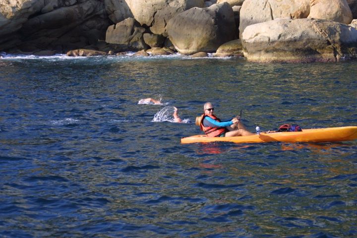 Dia da prova de 1000m do Marathon Guadalupano. Logo entendemos qual o sentido do termo maratona neste caso: nadar os 1000 m é a parte fácil. São mais de 4000 nadadores inscritos que devem ser levados até uma pequena ilha e de lá vem nadando. Então pode-se imaginar a logística que deveria estar preparada para isto. Enfim, após algumas dificuldades, todas superadas, a parte da natação foi ótima. Água limpa e quente, mar calmo e sem correntes, completamos mais uma! Voltamos da travessia em um ônibus local todo colorido tocando bem alto músicas do Roberto Carlos cantando em espanhol. A passagem custa 5 pesos mas a música e todo o conjunto da situação inusitada nao tem preço! Depois, à noite fomos ver a atração mais emblemática de Acapulco. Os Clavadistas de La Quebrada. Jovens mergulham de uma altura de até 35 metros entre os rochedos em um lugar que a profundidade é em torno de 7 m. Então eles tem que esperar que uma onda maior aumente a profundidade para poder pular lá de cima executando saltos bem elaborados. A imagem ficou famosa quando apareceu em filmes do Tarzã. É imperdível e os meninos são muito corajosos. Quando estávamos em Lá Quebrada sentimos a Rocha tremer e pensamos que era o efeito das ondas quebrando nas pedras lá embaixo. Depois descobrimos que tinha ocorrido um terremoto de 6,5 pontos com epicentro a 150km de Acapulco.