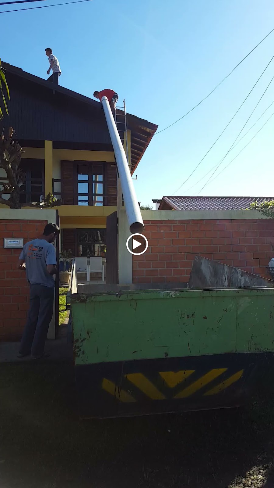 | Despejo das telhas antigas direto na caçamba de entulho. |